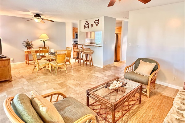 Relax in this living room on the comfortable chairs or couch, while looking outside. Easy access to the lanai.